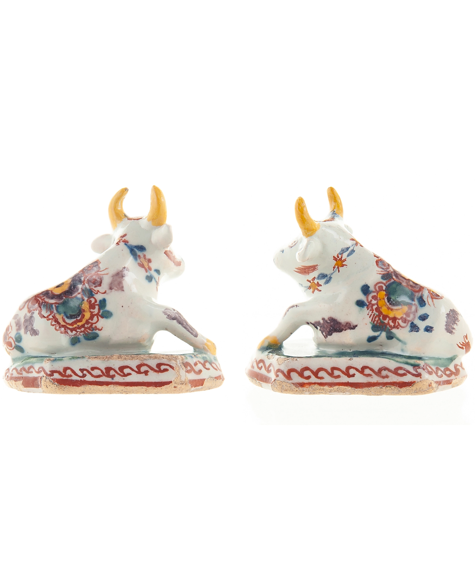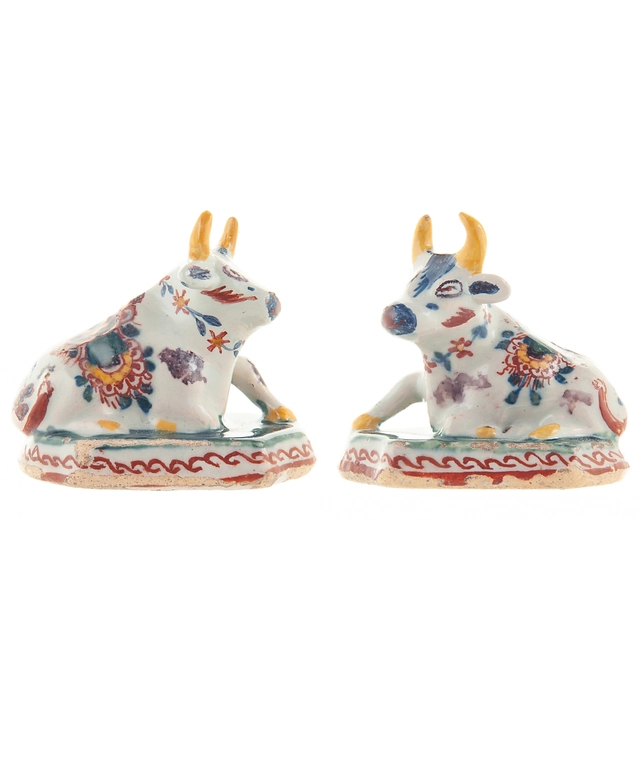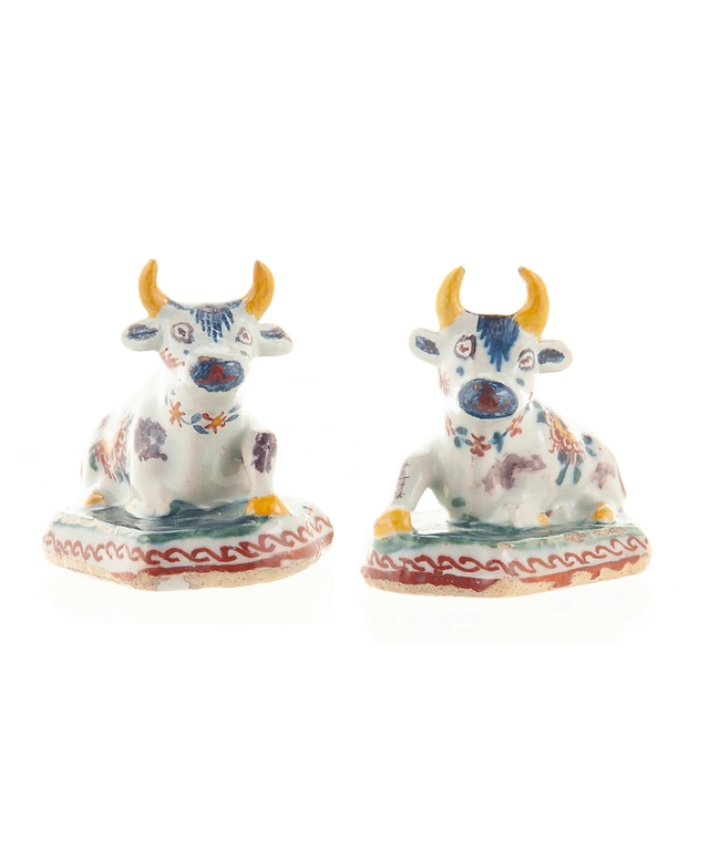 Pair of Miniature Dutch Delft Polychrome Figures of Recumbent Cows