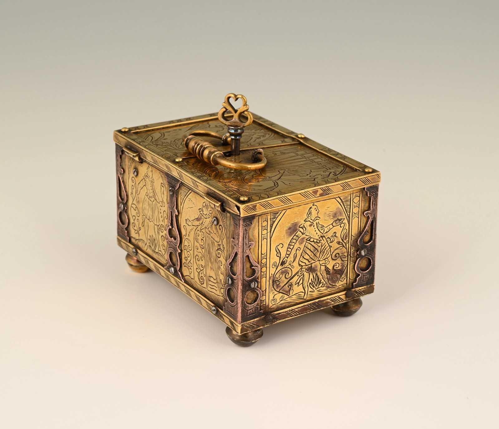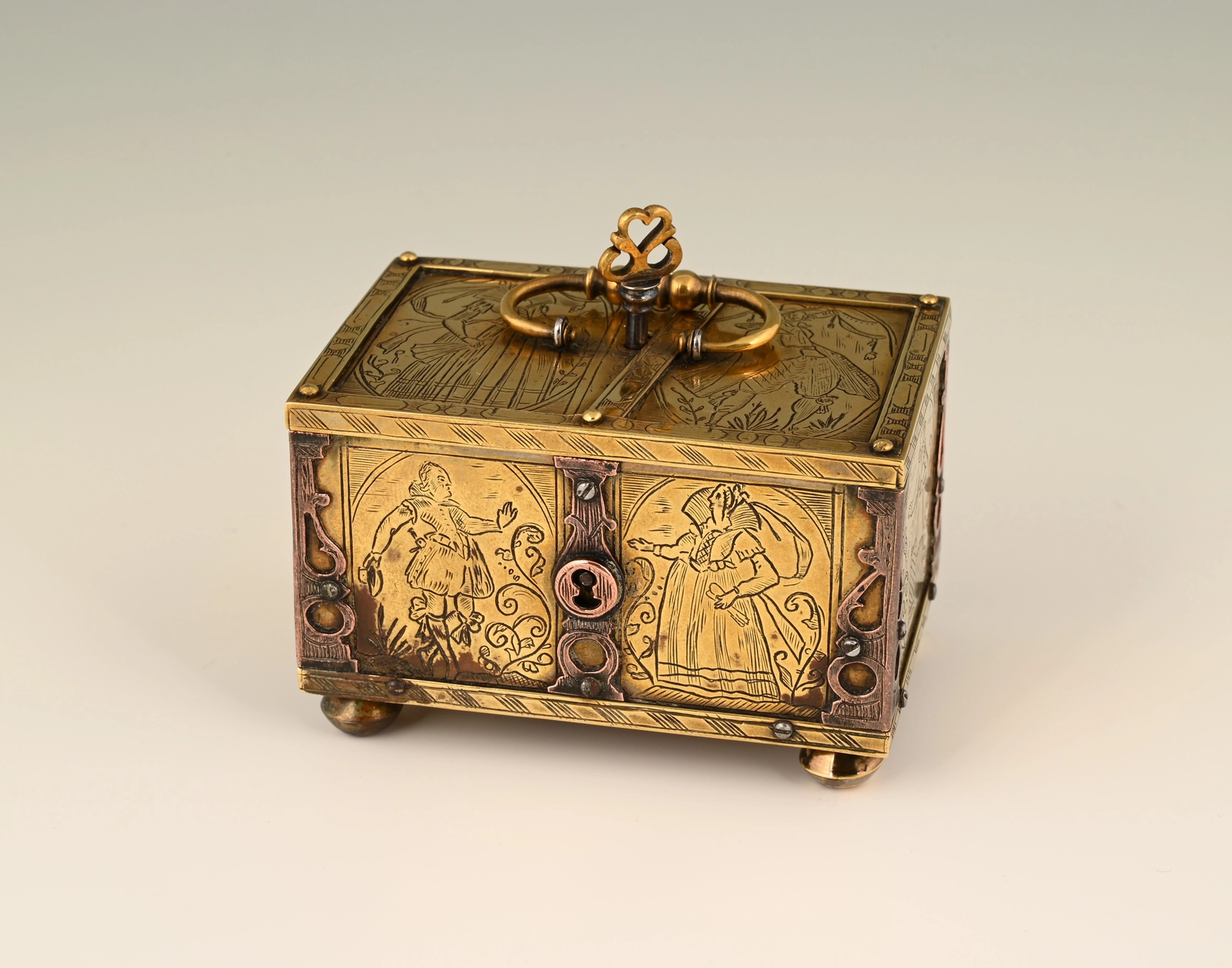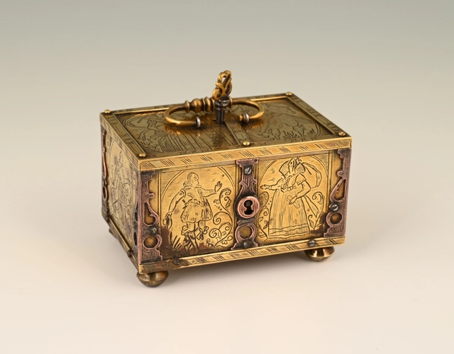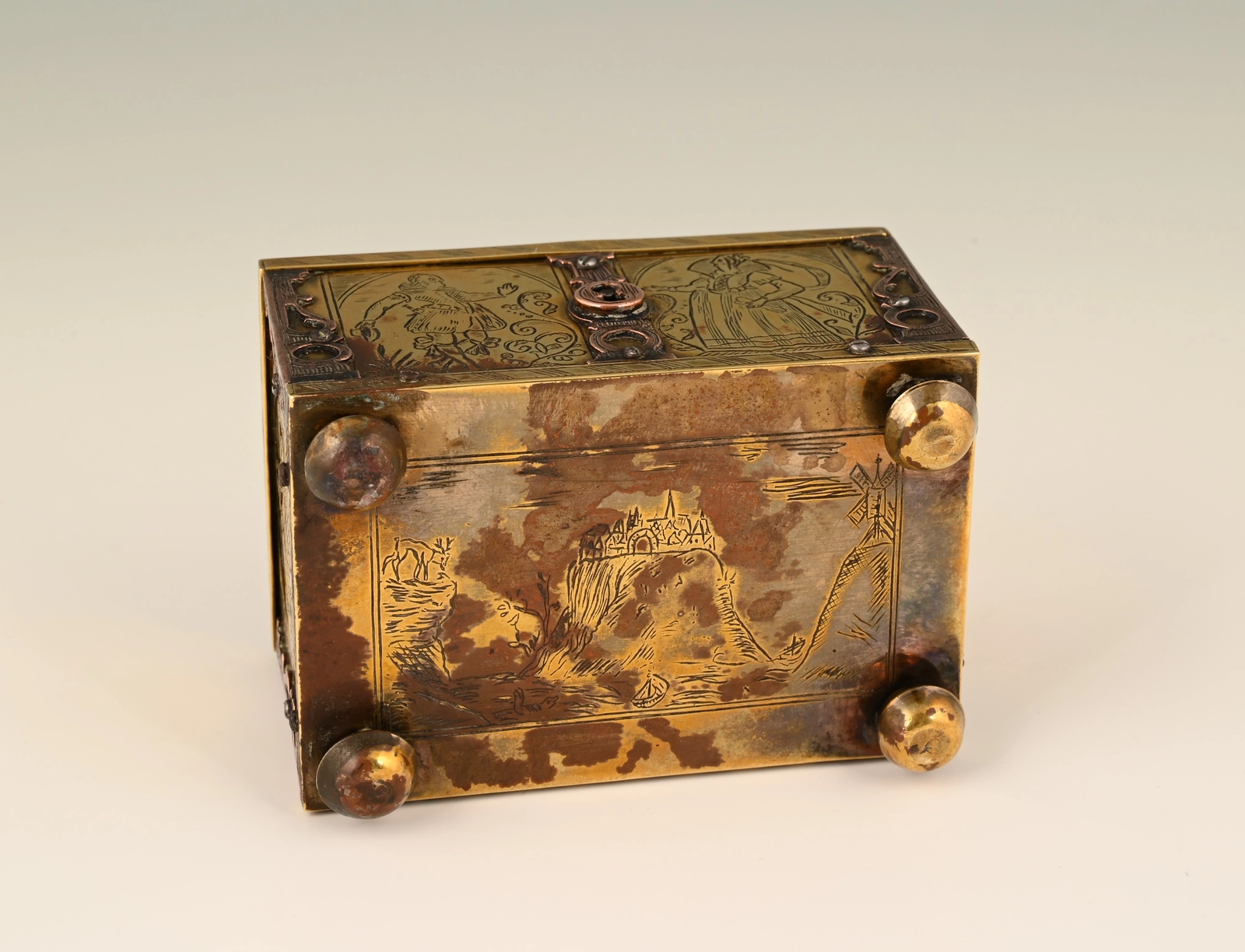 This box is made of engraved brass, the corner frames of engraved copper.