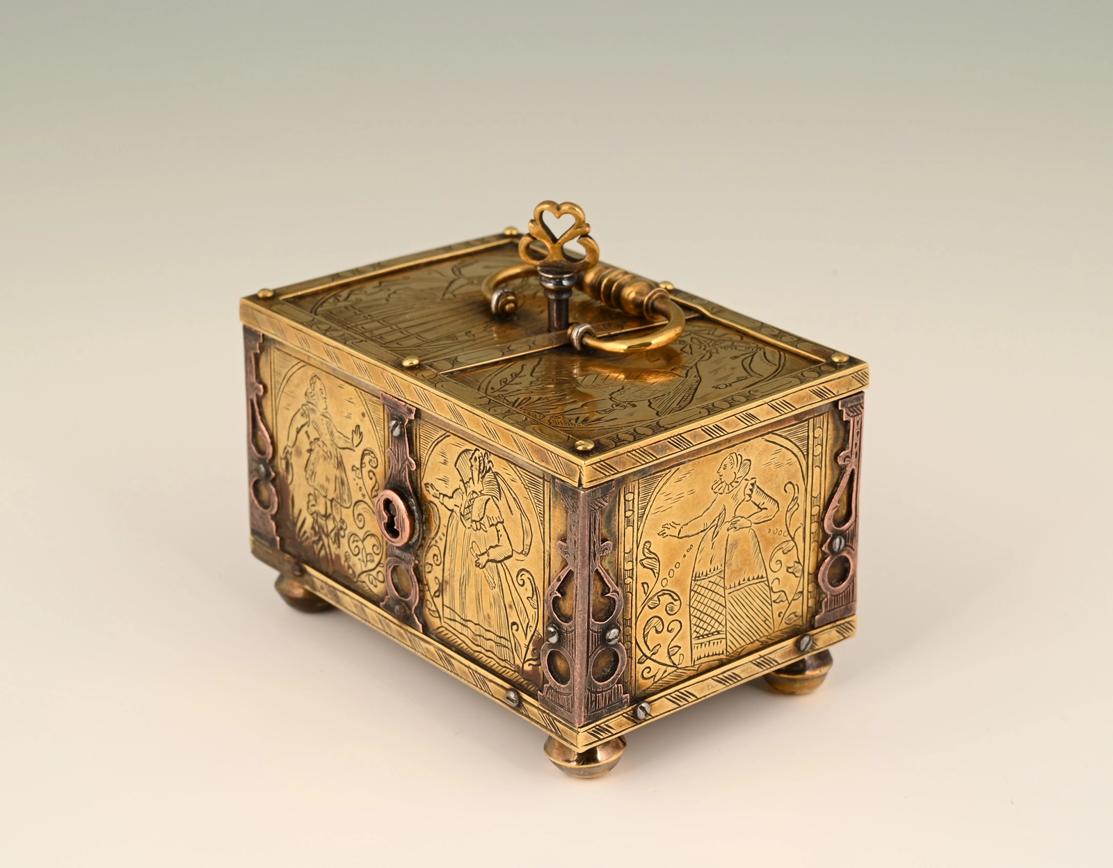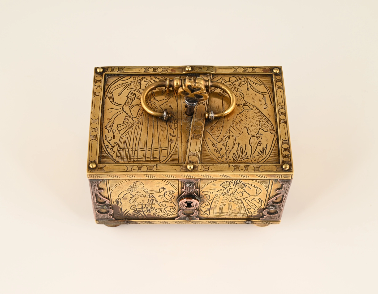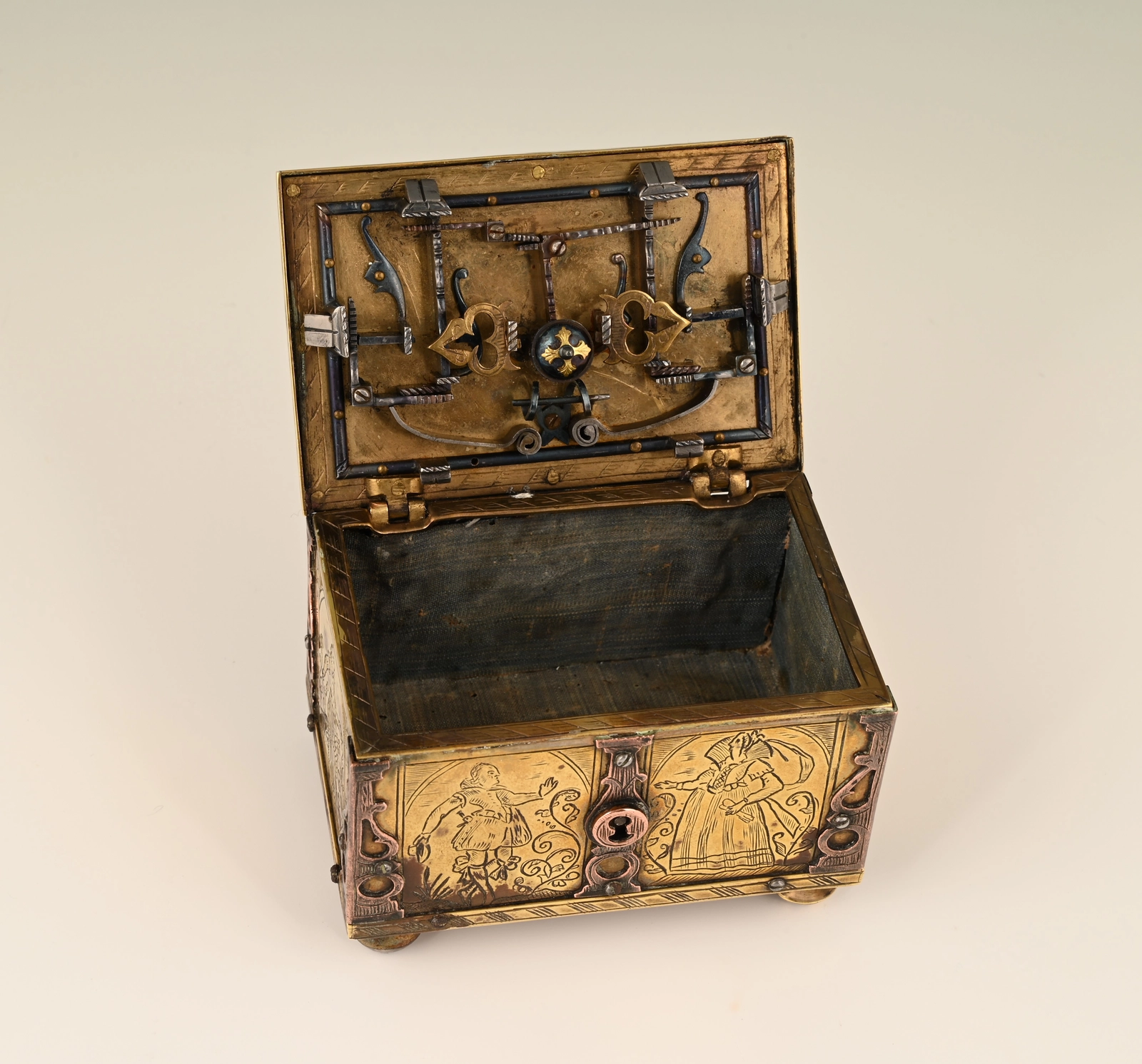 This box is made of engraved brass, the corner frames of engraved copper.