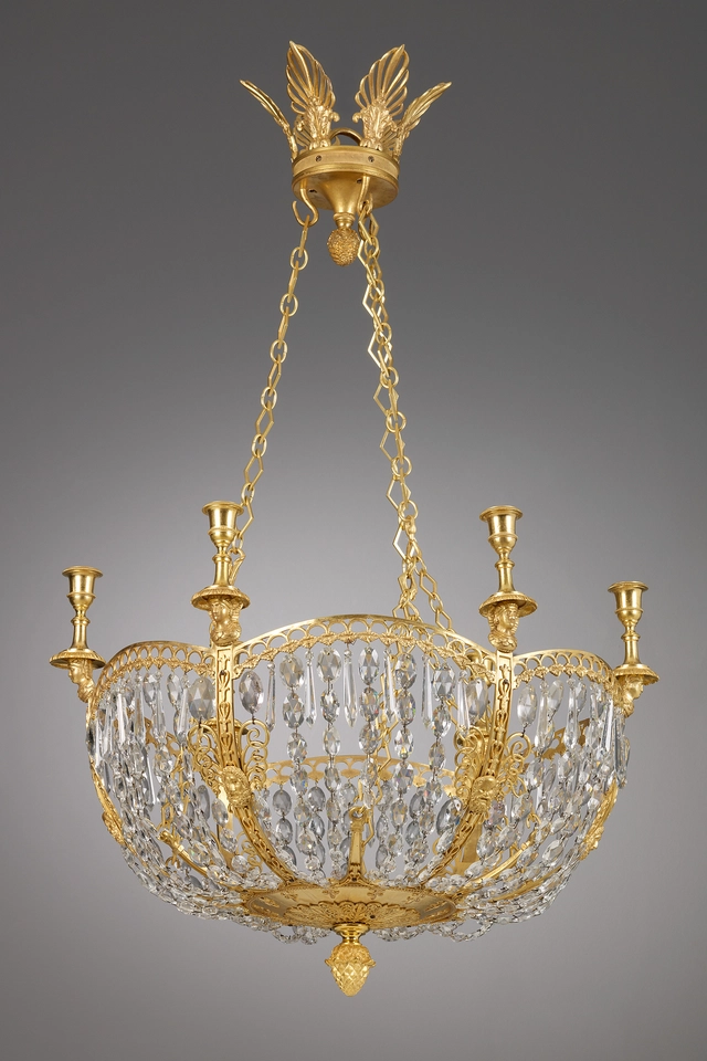 A Russian chandelier with a startling design. A bowl with openwork appliques ends in a pine-cone at the bottom. Six long and six shorter strips bend upwards. The longer strips end in candle-holders that are carried by a female head in an Egyptian inspired style. The strips are embellished with openwork motives and male masks in ‘Gout Étrusque”. The shorter strips end in suspension eyes from which the chandelier is hanging from chains with diamond-shaped links. The longer arms of the chandelier are connected with an openwork rim. Crystal shapes hang from the rim to the base as garlands.