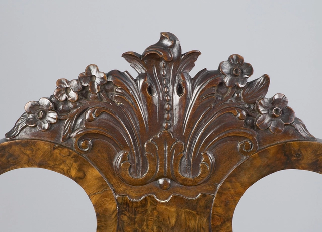 The legs ending in ball and claw feet, which indicates the fairly early date of these chairs. The central splat of the back in the form of a baluster, the sides in C- and S-volute shapes.