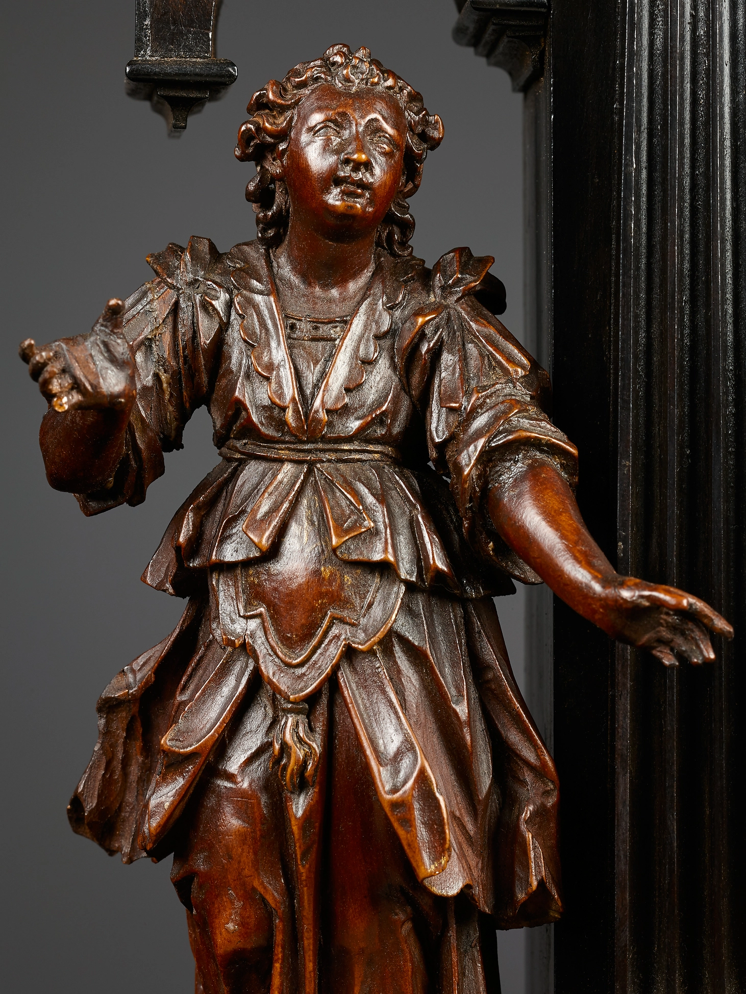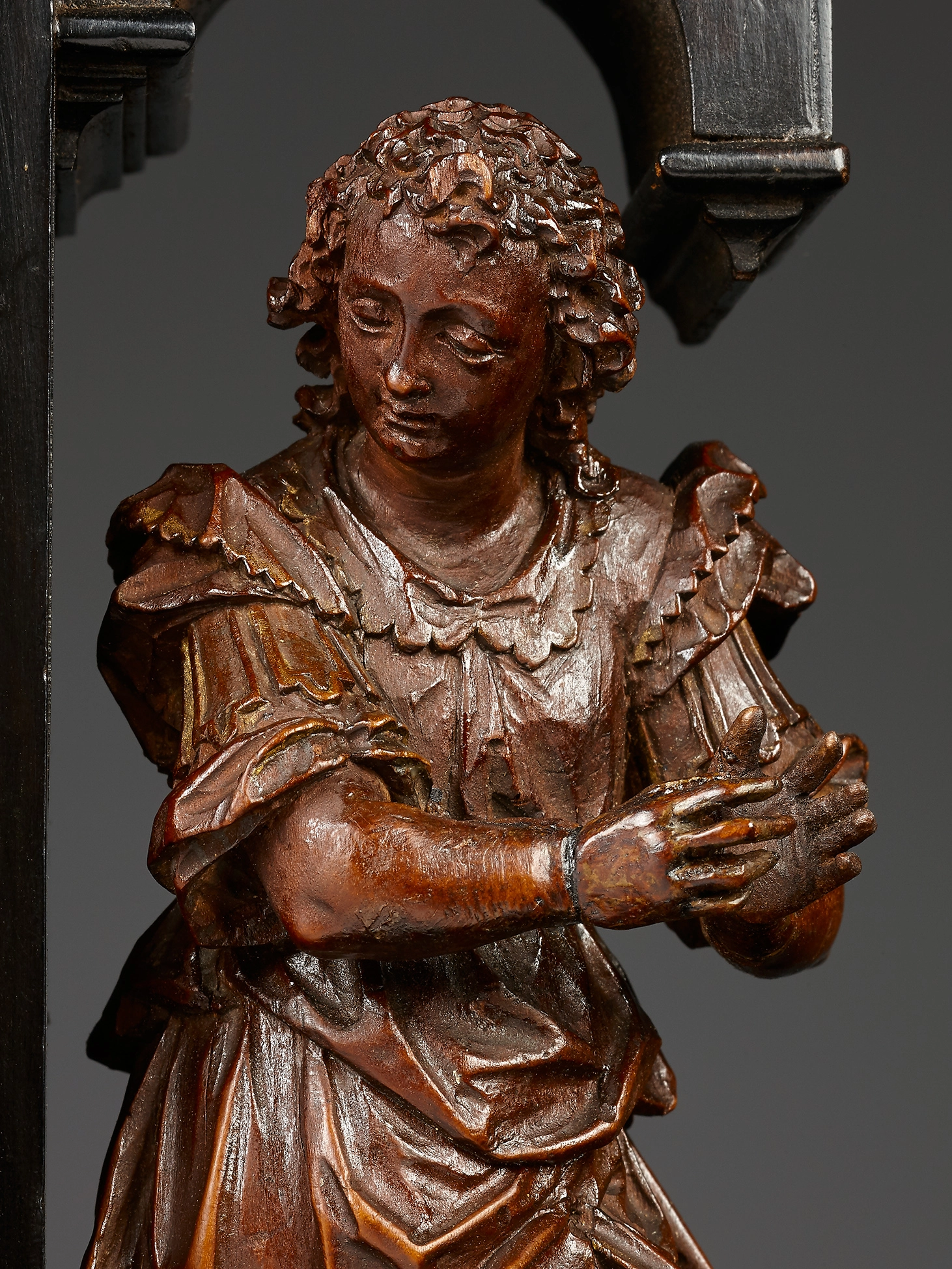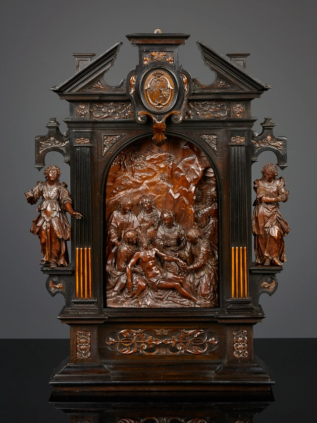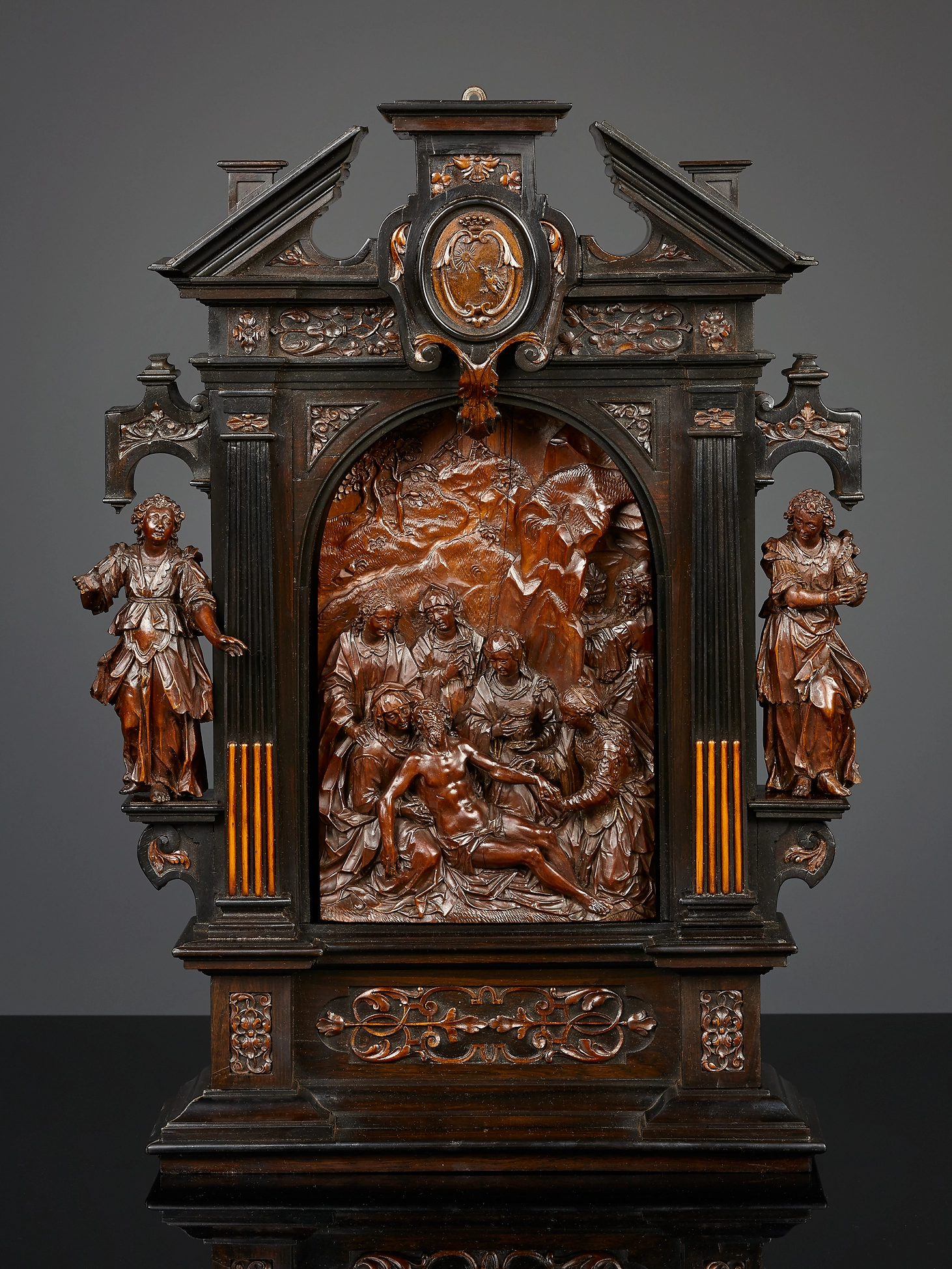 This South German house altar, probably made in Augsburg or Munich, is with certainty by the hand of a very skilled, as yet unknown, master sculptor. Both the centrally placed relief and the Mannerist execution of the altar that encloses the relief were created with enormous virtuosity. Also the very refined and detailed execution of the sculpture contributes to the assumption that a master has been at work here. These small house altars were a very luxurious, precious and rare commodity.