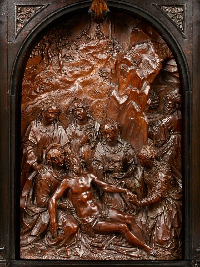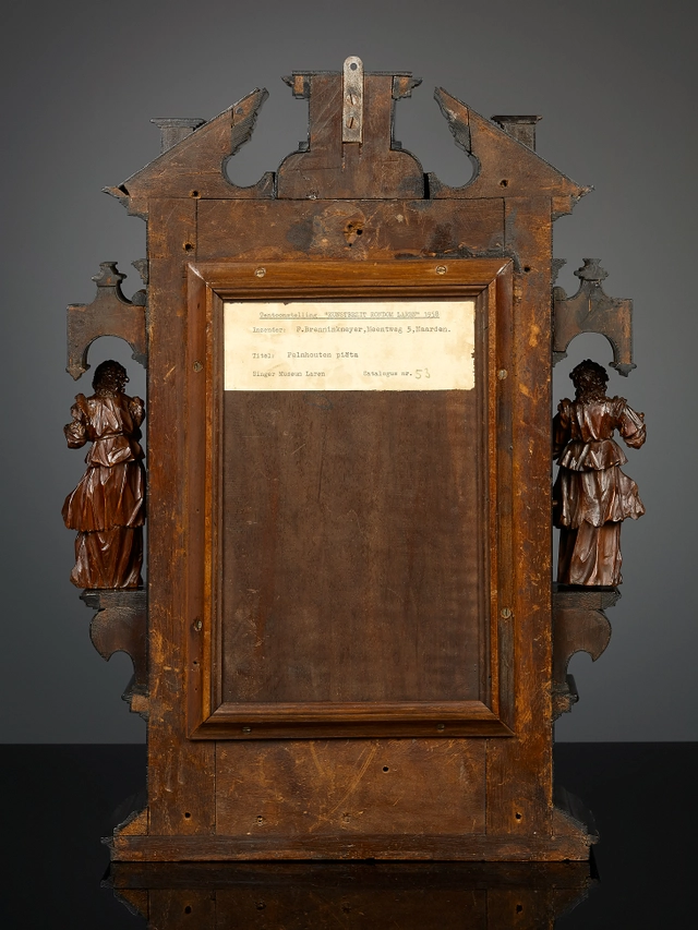 Christ's body, just taken from the cross, hangs limp in the womb of his mother Mary. His arms are spread. She is supported by John, to whom Jesus had entrusted the care of his mother from the cross. Three holy women bewail Christ. Mary Magdalene can be recognized by her ointment jar. In the background, the ladders are removed from the cross. Nicodemus watches from a cave, Christs’ tomb. According to the Bible, he would embalm and bury Christ. Although this home altar is described as Pieta in the catalog of the Laren exhibition in 1958, it is a lamentation and not a Pieta. Only Mary, Christ and possibly angels are depicted on a Pieta. Because there are more minor characters in this scene, this is called a lamentation.