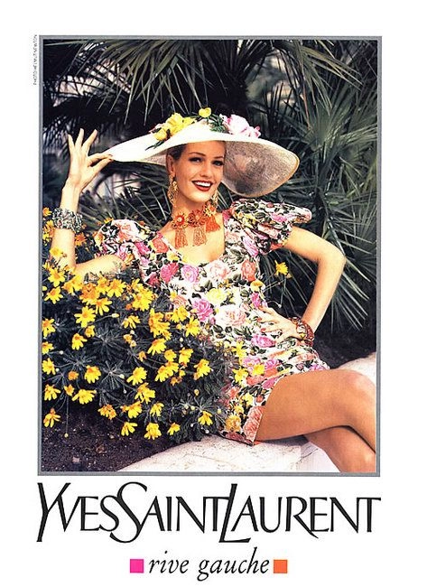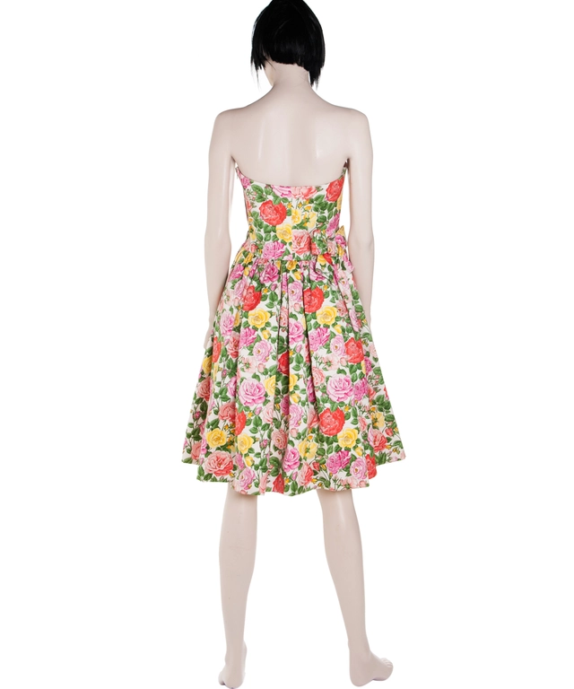 This cocktail dress has a ruched bustier bodice and a full pleated skirt. The dress is made of a thick cotton in a green, yellow, pink and red floral print. The bodice has a dropped waistline with a pleated skirt and a bow at the back.
