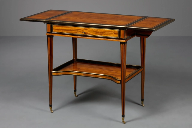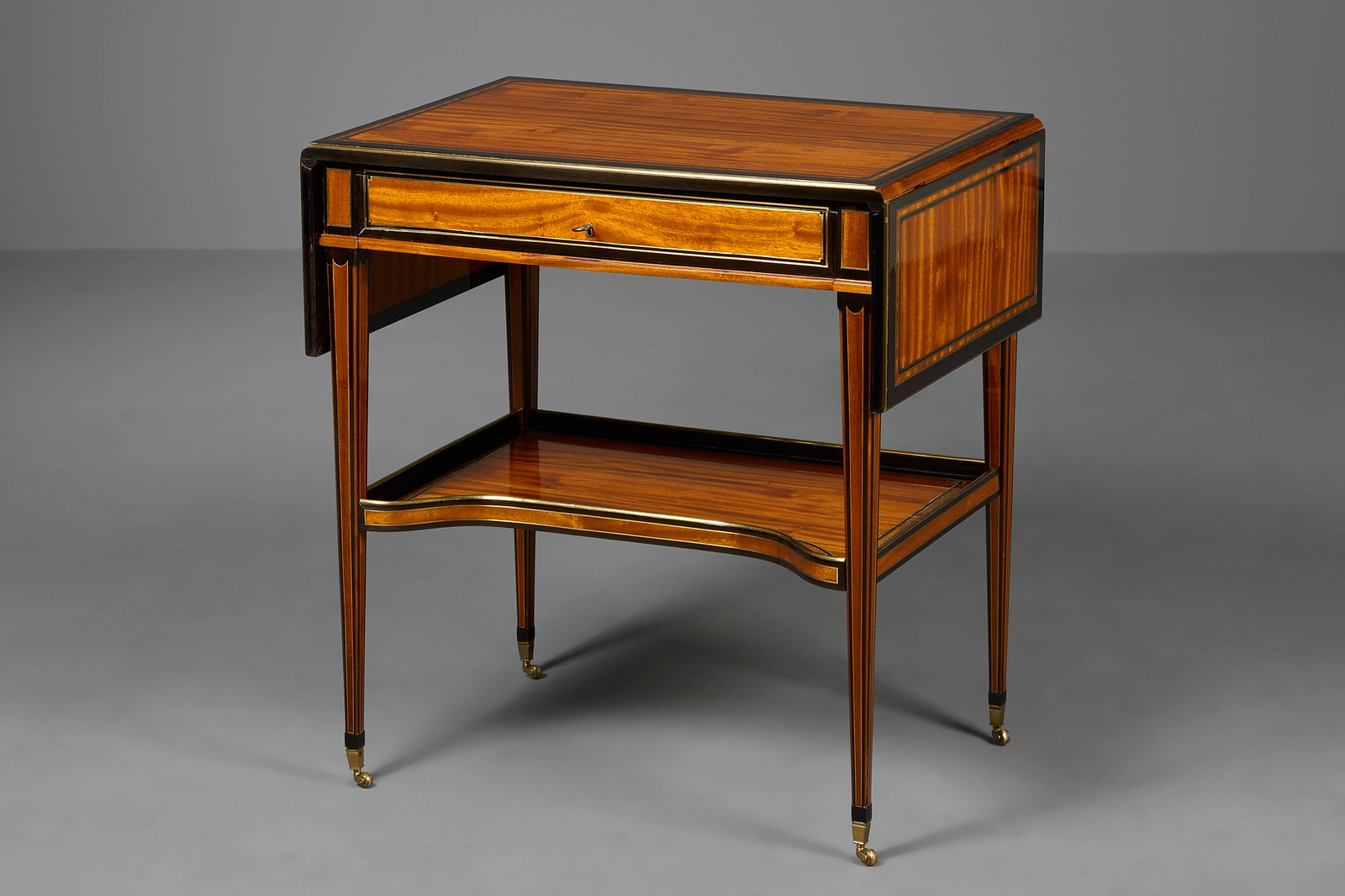 An exquisitely refined rectangular Viennese table with twin flaps to the long sides. With a single drawer to the front, which is closed by a sliding top. The table stands on elegant tapering legs terminating in brass castors and are united by an under-tier.