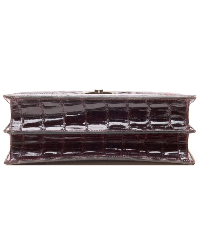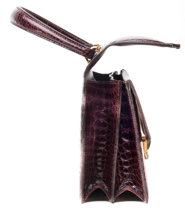 1950s day bags were rich with expensive leather made of exotic skins. Additional treatments, such as quilting, embossed leather, shiny patent, and textured fabrics, added more interest to simple rectangular shapes. New inventions in fasteners, such as the twist lock and a revival of the folding frame, contributed to the sophisticated yet modern aesthetic. Locks, flaps and trim were frequently made of gold or patent leather to add even more richness. Set against the primary color of the decade, black, the bags were anything but utilitarian.